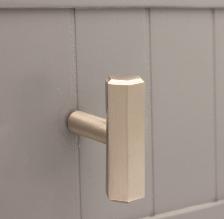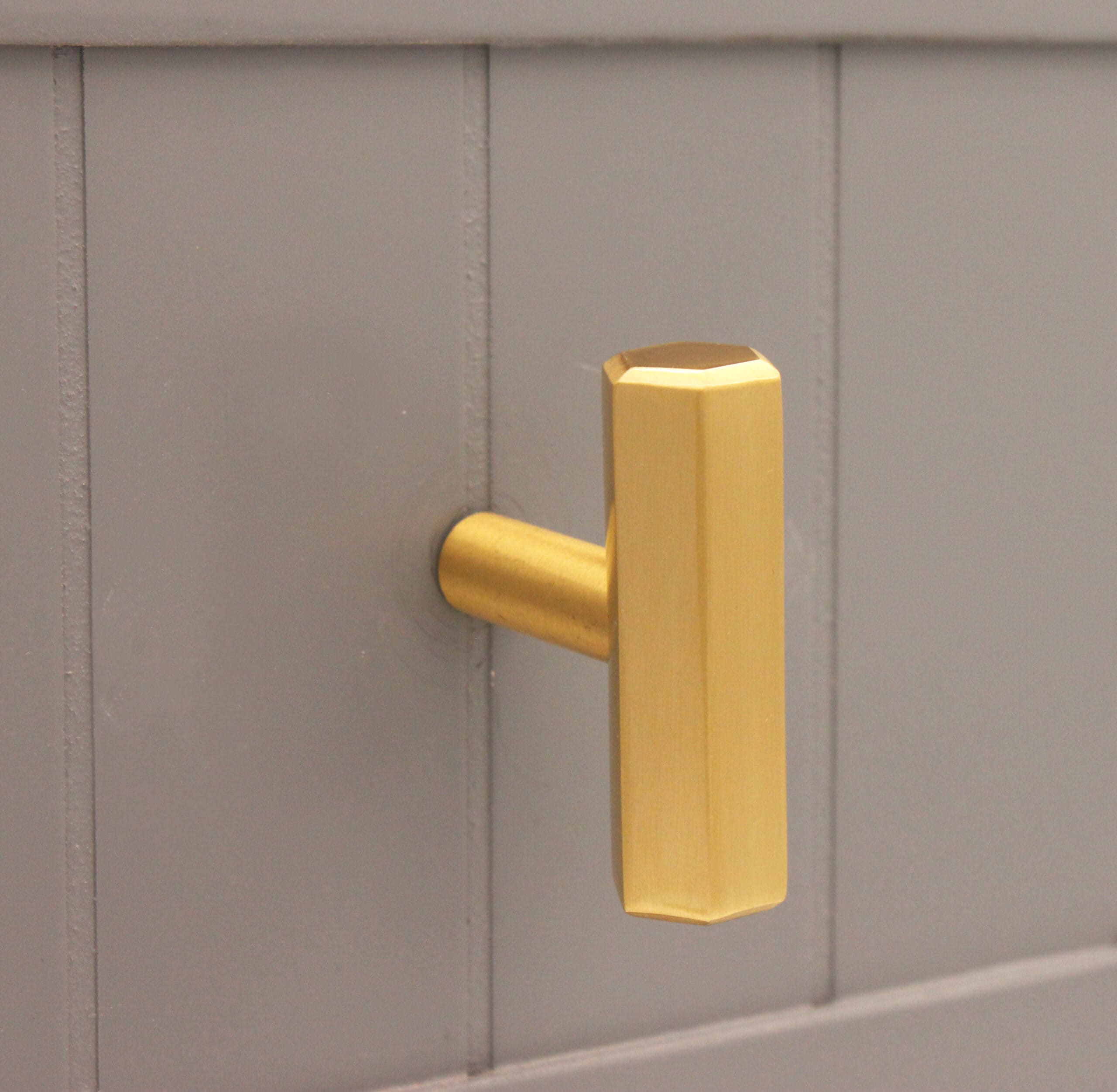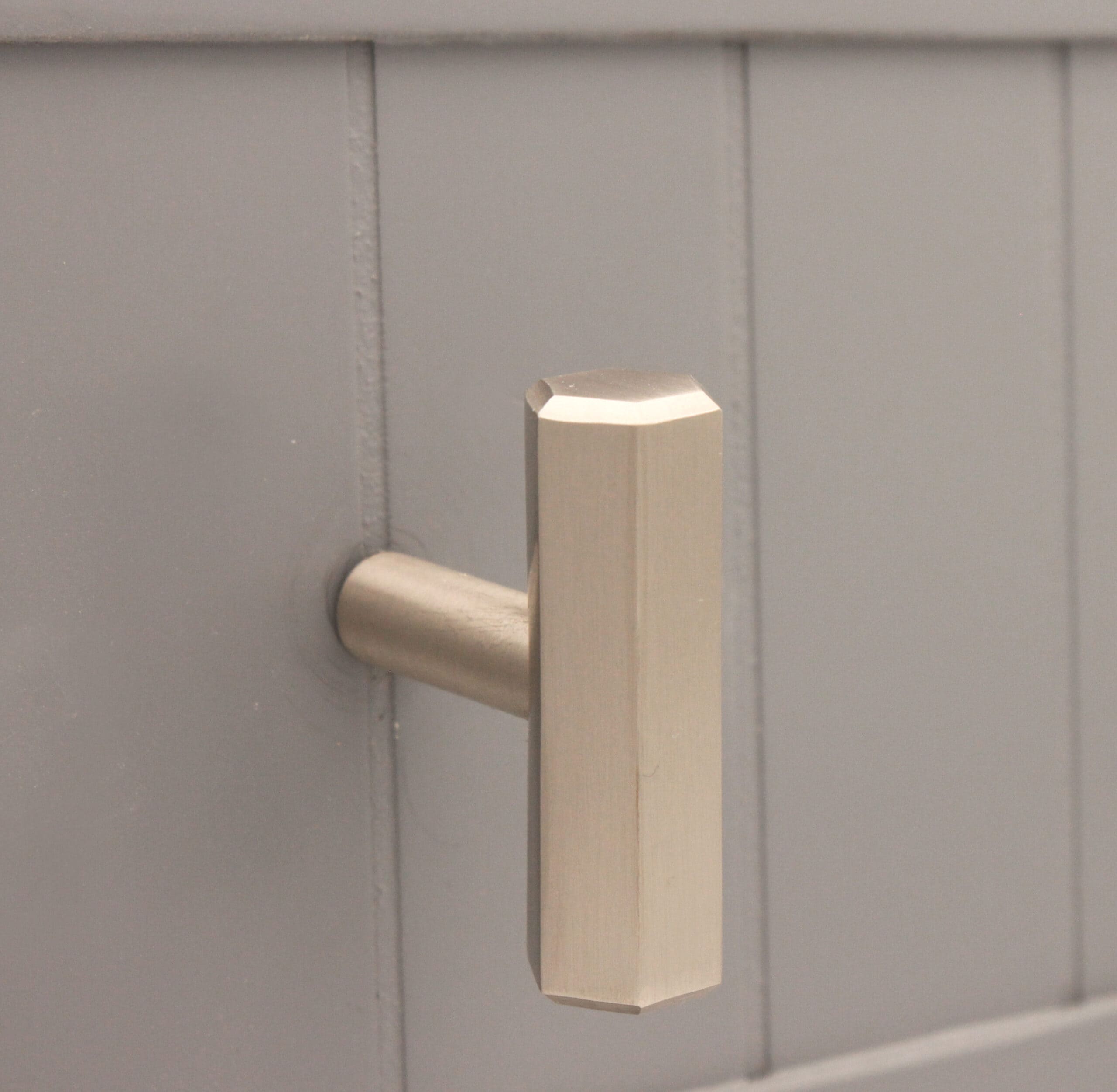 This modern ‘Hexagonal T Bar Cupboard Pull’ has a comfortable grip and provides a good torque when opening cabinets and drawers. Solid Brass construction gives it a contemporary look with a touch of opulence and style.
