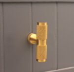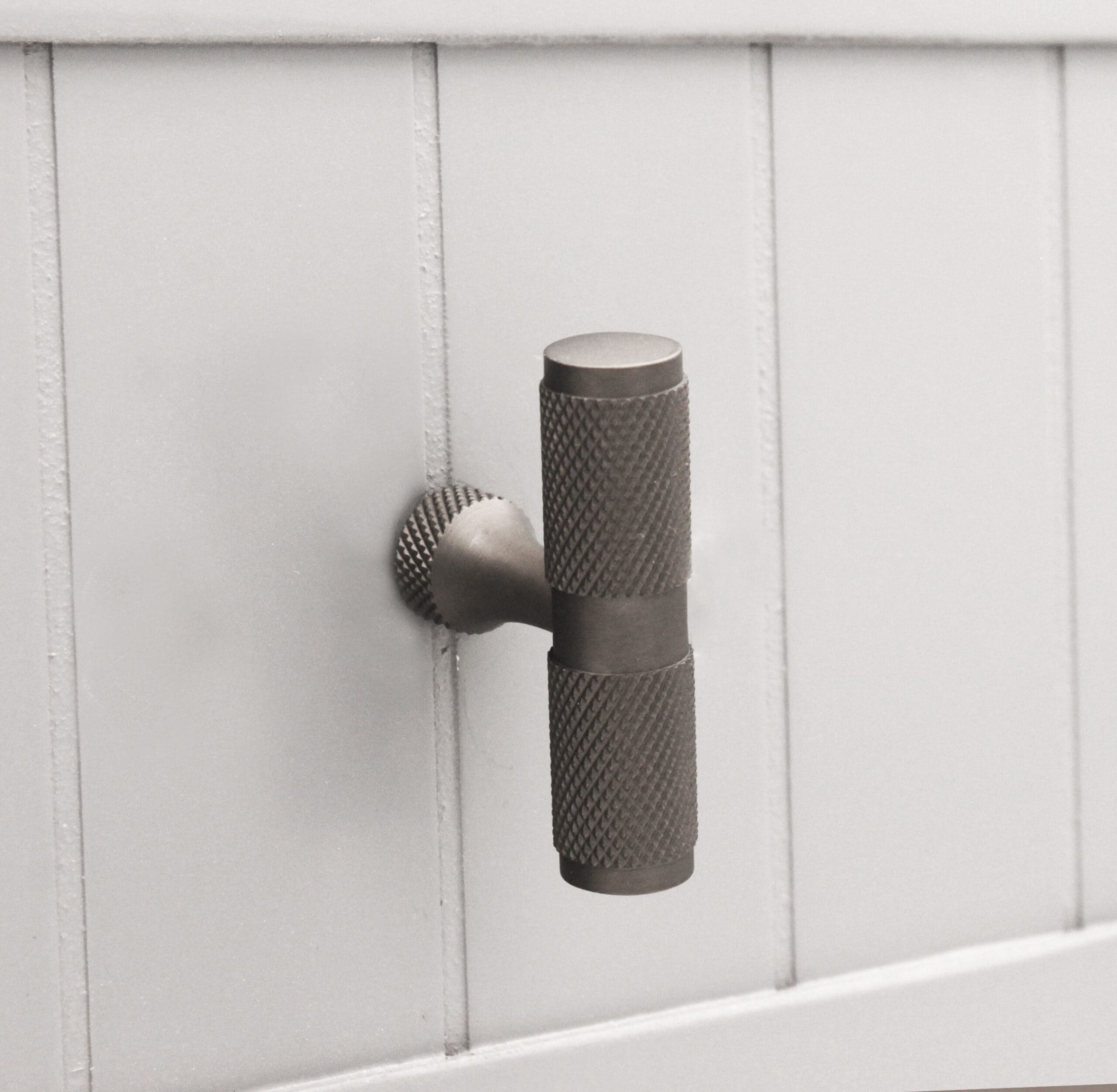 This modern knurled T bar cupboard pull has a comfortable grip and provides a good torque when opening cabinets and drawers. Solid Brass construction gives it a contemporary look with a touch of opulence and style.