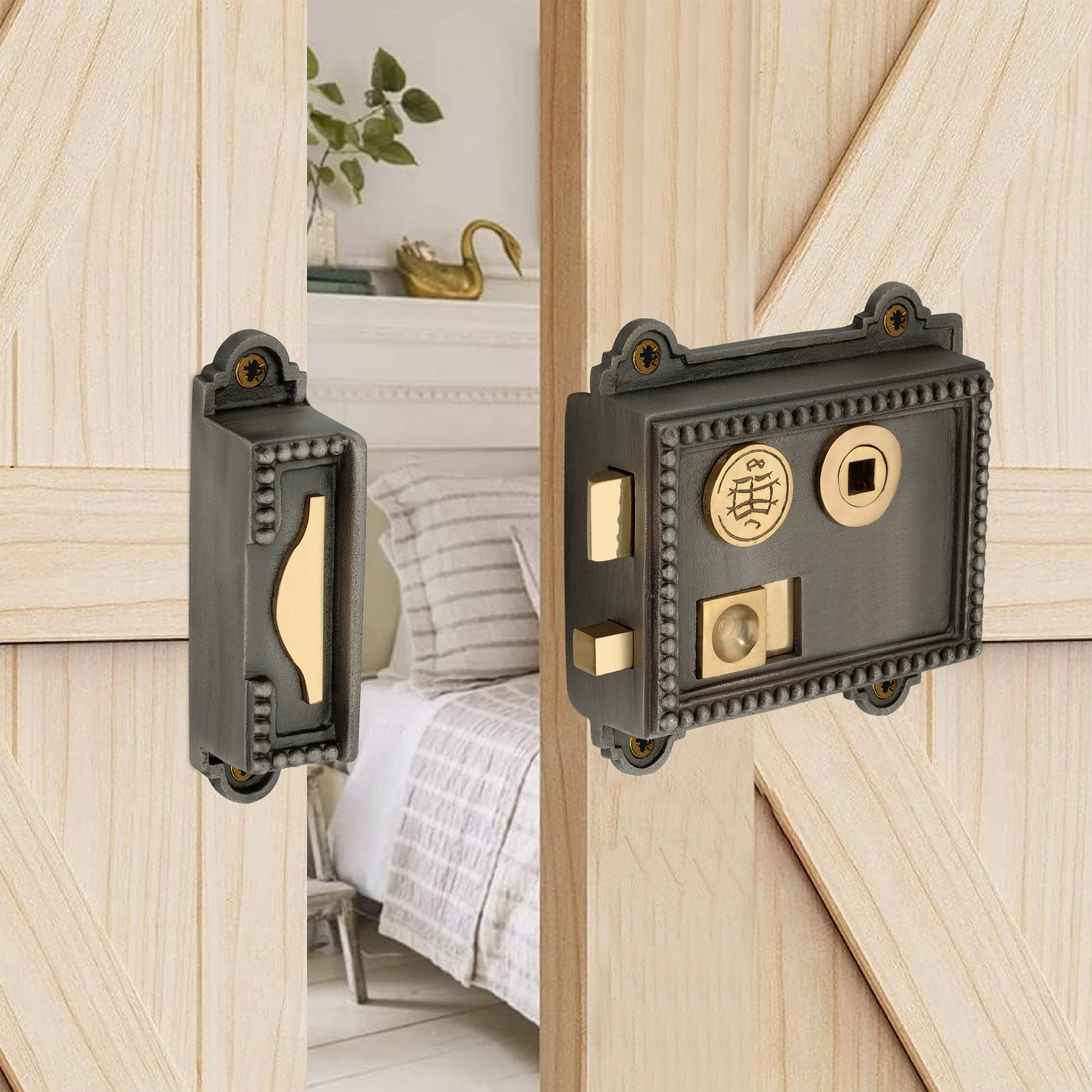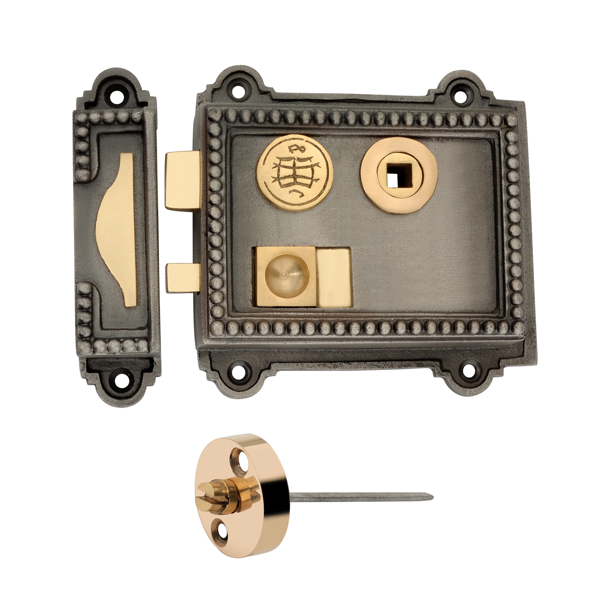 Our ‘Regency Rim Latch’ with a beautiful dotted victorian pattern of a solid cast iron & a single lever dual handed includes thumb nail rim latch with brass fittings in a hand aged finish. Complete with emergency release, facilitating access from outside the room. Each lock is hand finished and is supplied with a lock keep. This can be fitted on the left or right hand side of a door to suit your requirements.