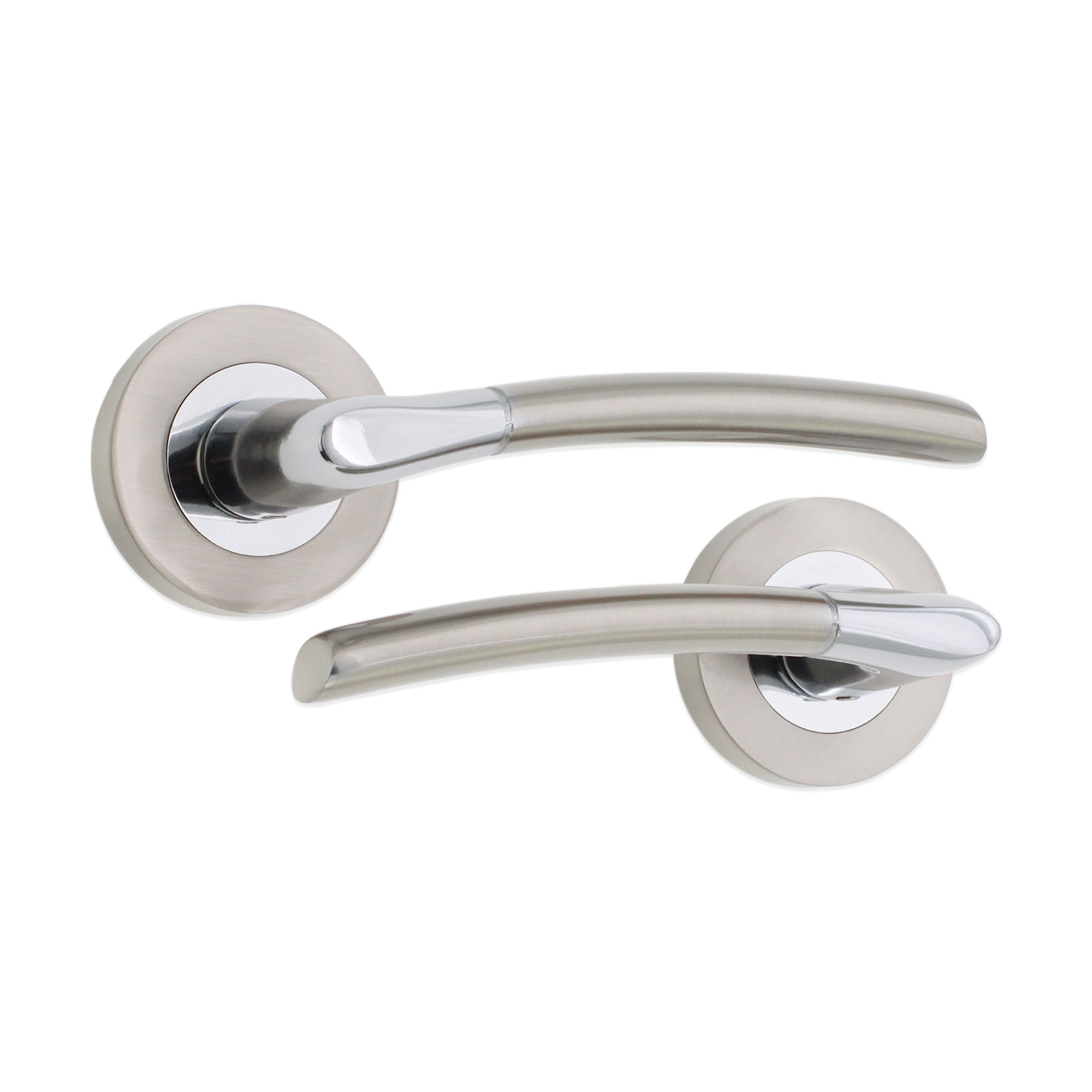 Our contemporary in style ‘Slavia’ internal door handles, pair on a sprung rose, feature a smooth touch finish that feels comfortable and tactile with a curved lever handle design. This can be used on their own, for regular passage doors, or can be combined with locking or bathroom escutcheons if security/privacy is required.