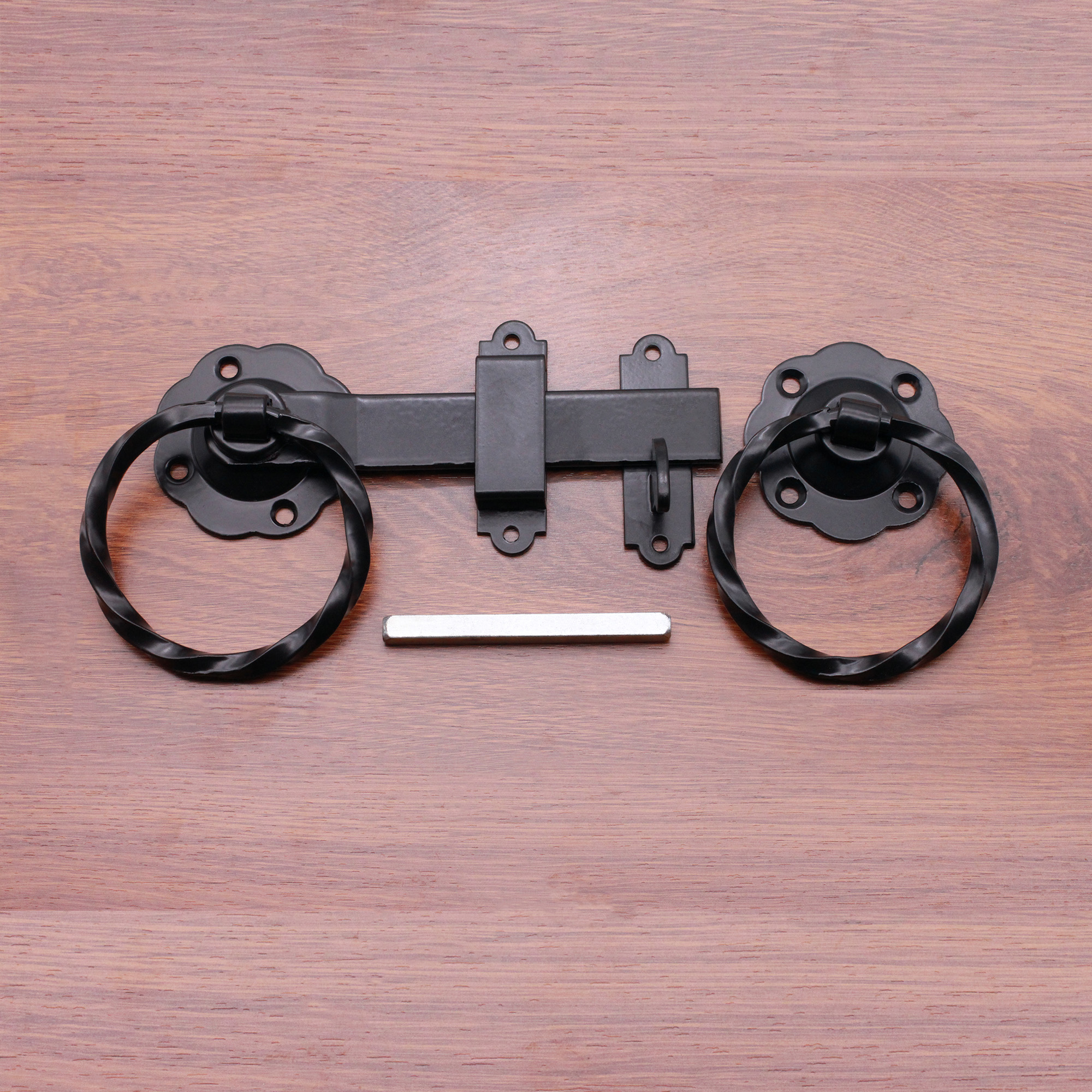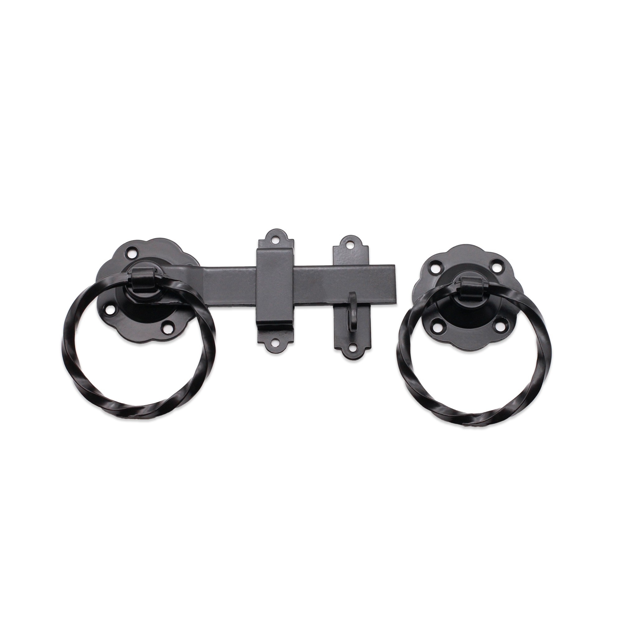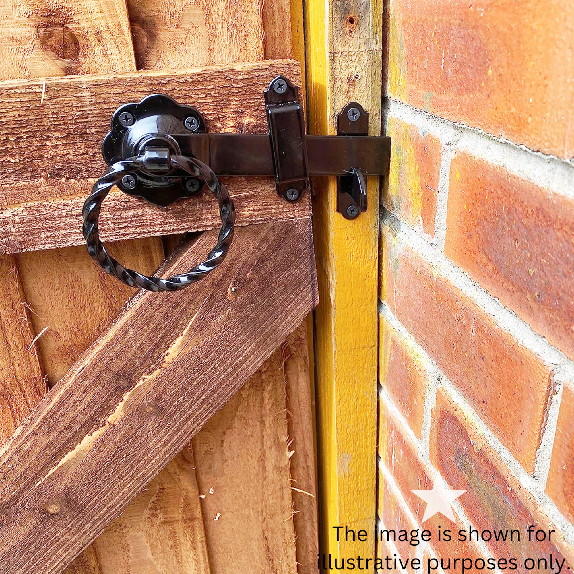 The ‘Twisted Ring Gate Latch’ is made with a Steel construction for strength and durability with black powder-coated finish for resistance to corrosion to be used externally or internally to securely close doors, garden gates and shed doors.