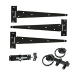 The Ironmongery Pack is the high-quality garden gate fitting kit comes with a standard 3 x T-Hinges with 1 x Brenton Bolt and 1 x Twisted Ring Gate latch, all comes with matching fixing screws with black powder-coated for resistance to rust and corrosion. To be used externally or internally to securely close doors, garden gates and shed doors. Accessible from both sides of the gates.